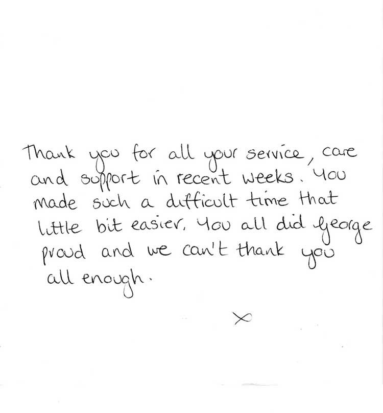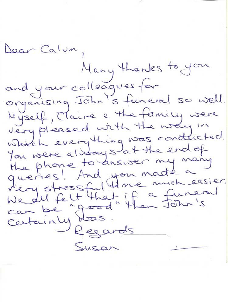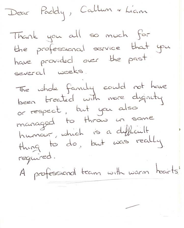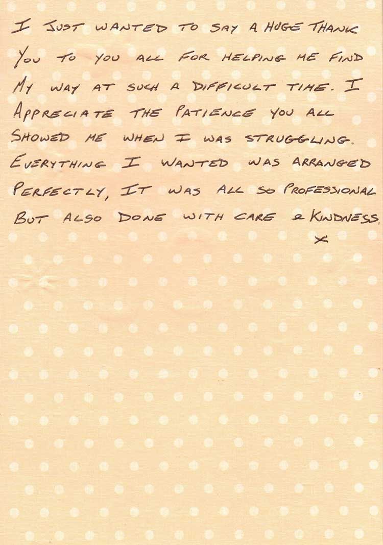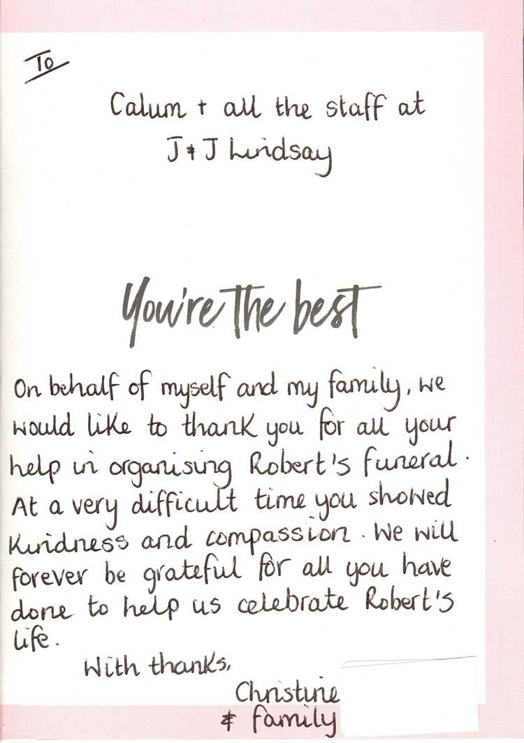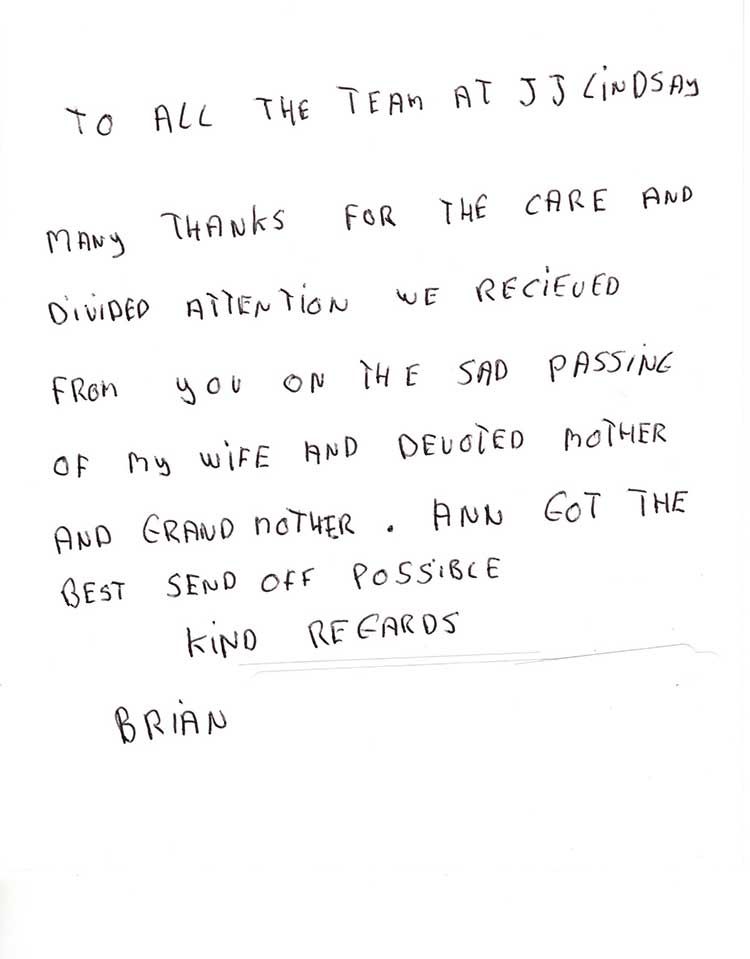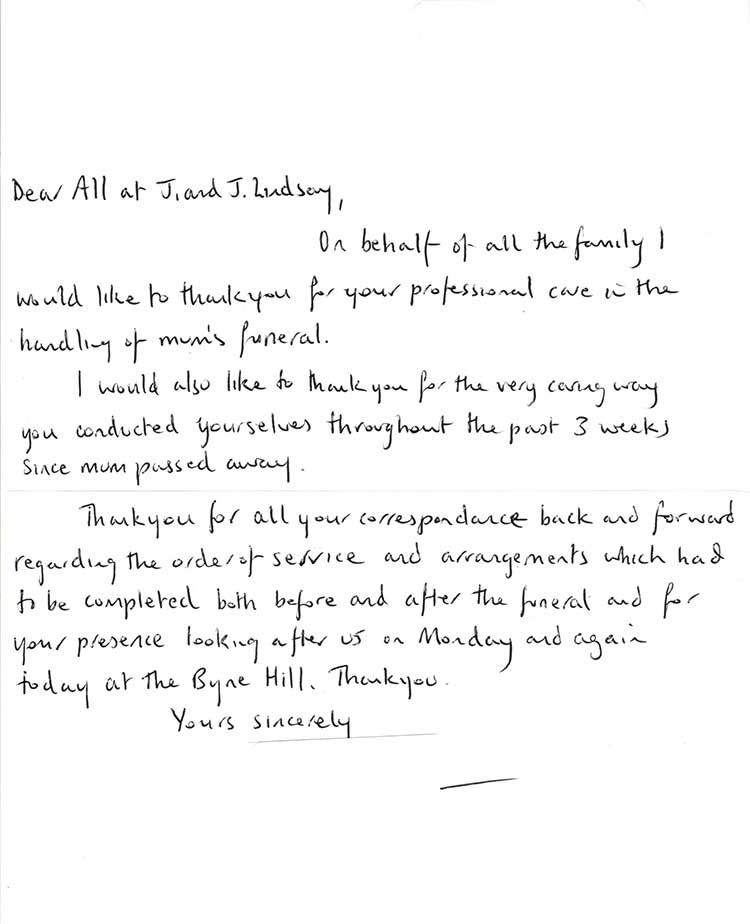 “My daughter and I would like to thank everyone at J & J Lindsay for everything they’ve done for us when my mum Lottie passed away it was comforting knowing my mum was in great hands. You took care of everything and the service was lovely, a special mention to Paddy, he is a credit to the company.”